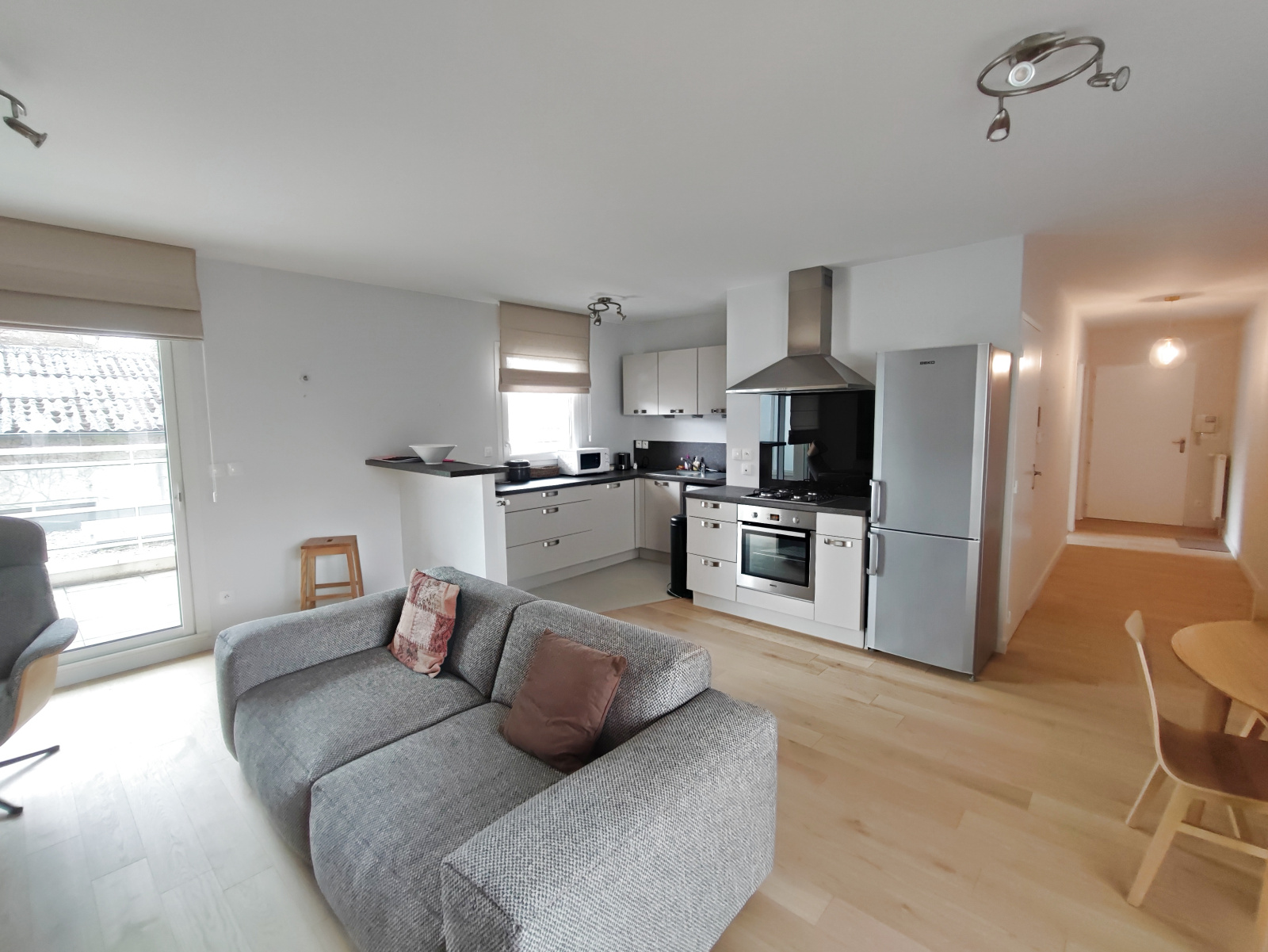 La spacieuse pièce de vie, baignée de lumière, se compose d’un salon et d’une salle à manger ouverts sur une cuisine entièrement équipée et fonctionnelle, offrant de nombreux rangements.