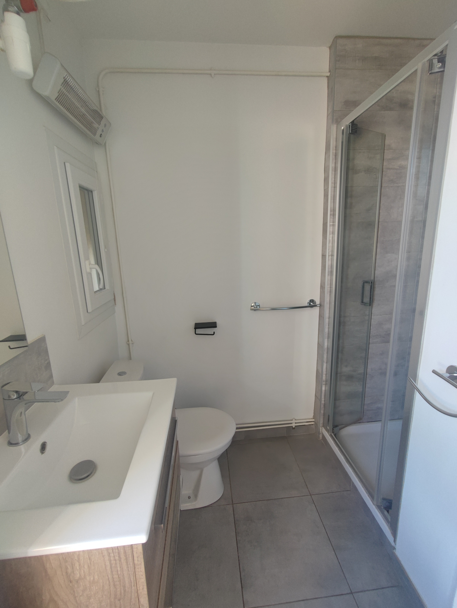une salle d’eau moderne avec douche, meuble vasque et WC.