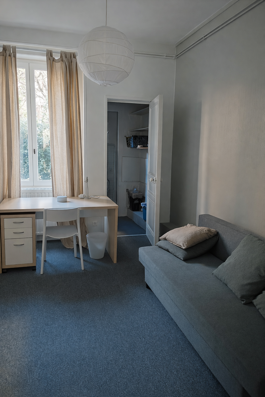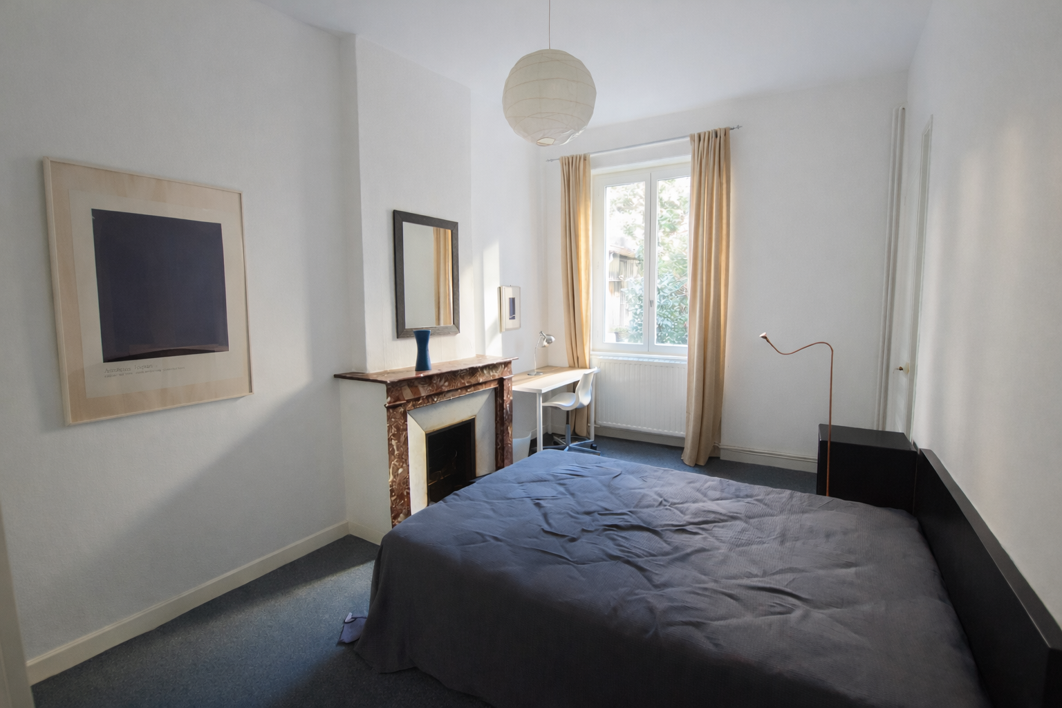 Ce logement dispose d'une cuisine indépendante, une agréable pièce de vie lumineuse, une première chambre comprenant un espace bureau et un lit double, ainsi qu’une seconde chambre offrant un espace bureau, un placard de rangement et un canapé clic-clac convertible.