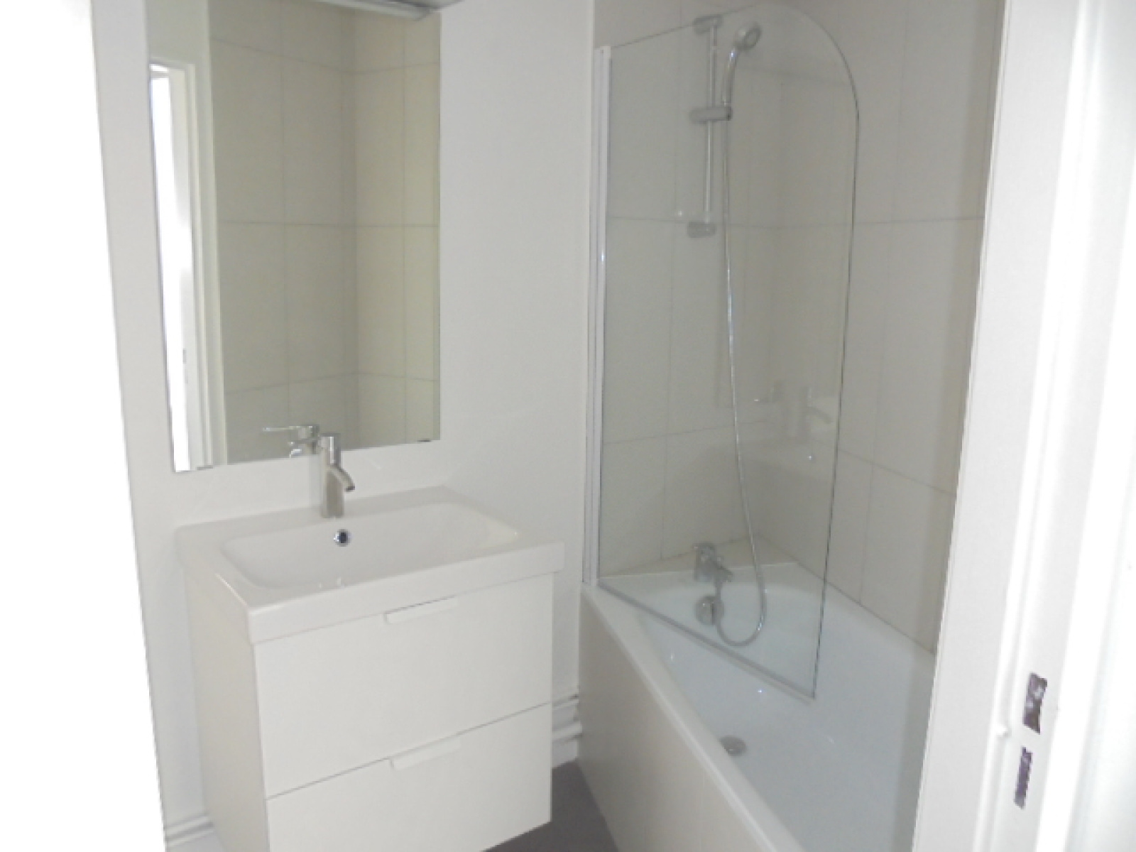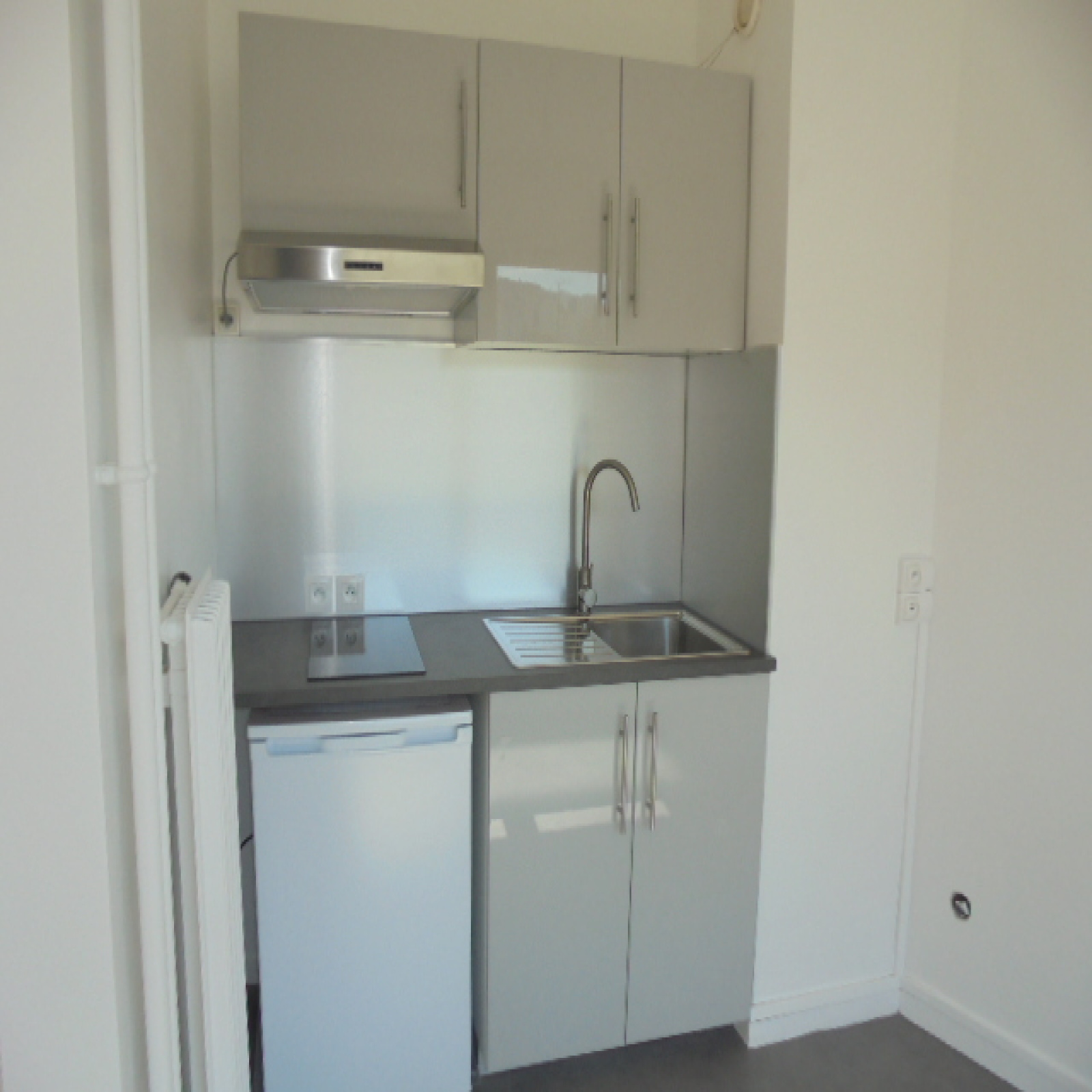 Appartement comprenant une entrée avec placards, cuisine ouverte et équipée (plaques et frigo), salle de bains avec baignoire.