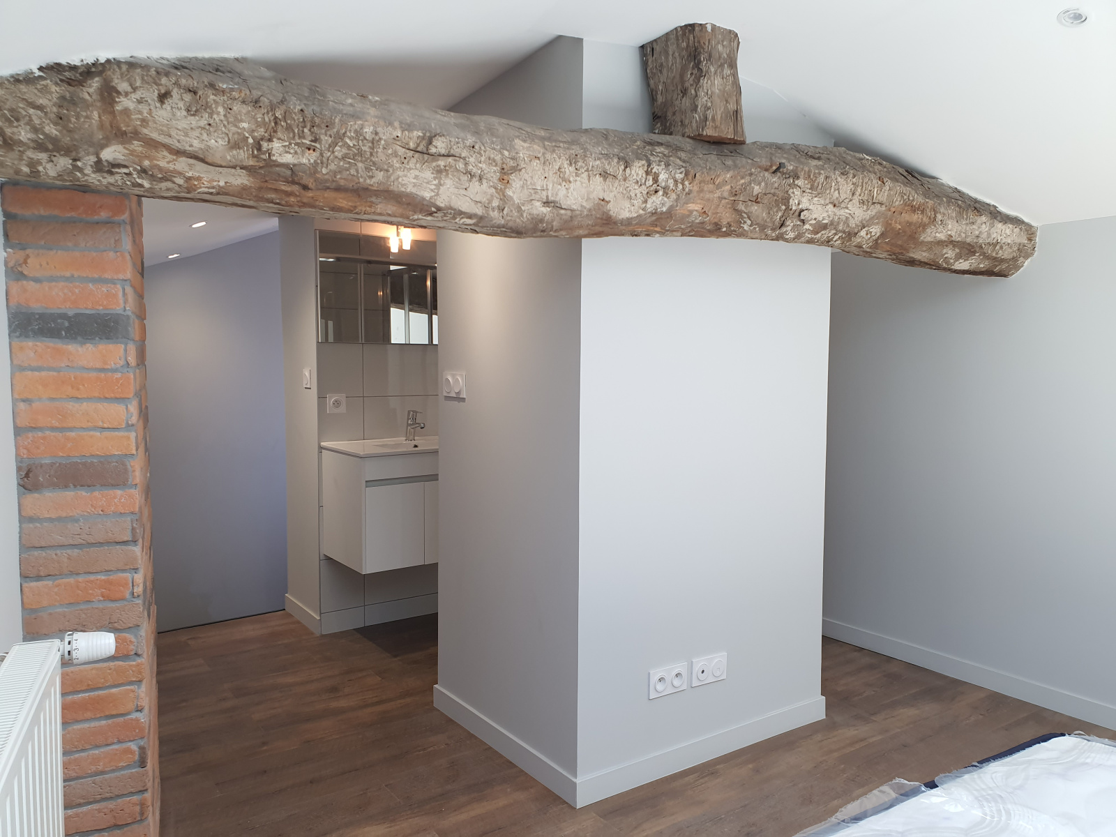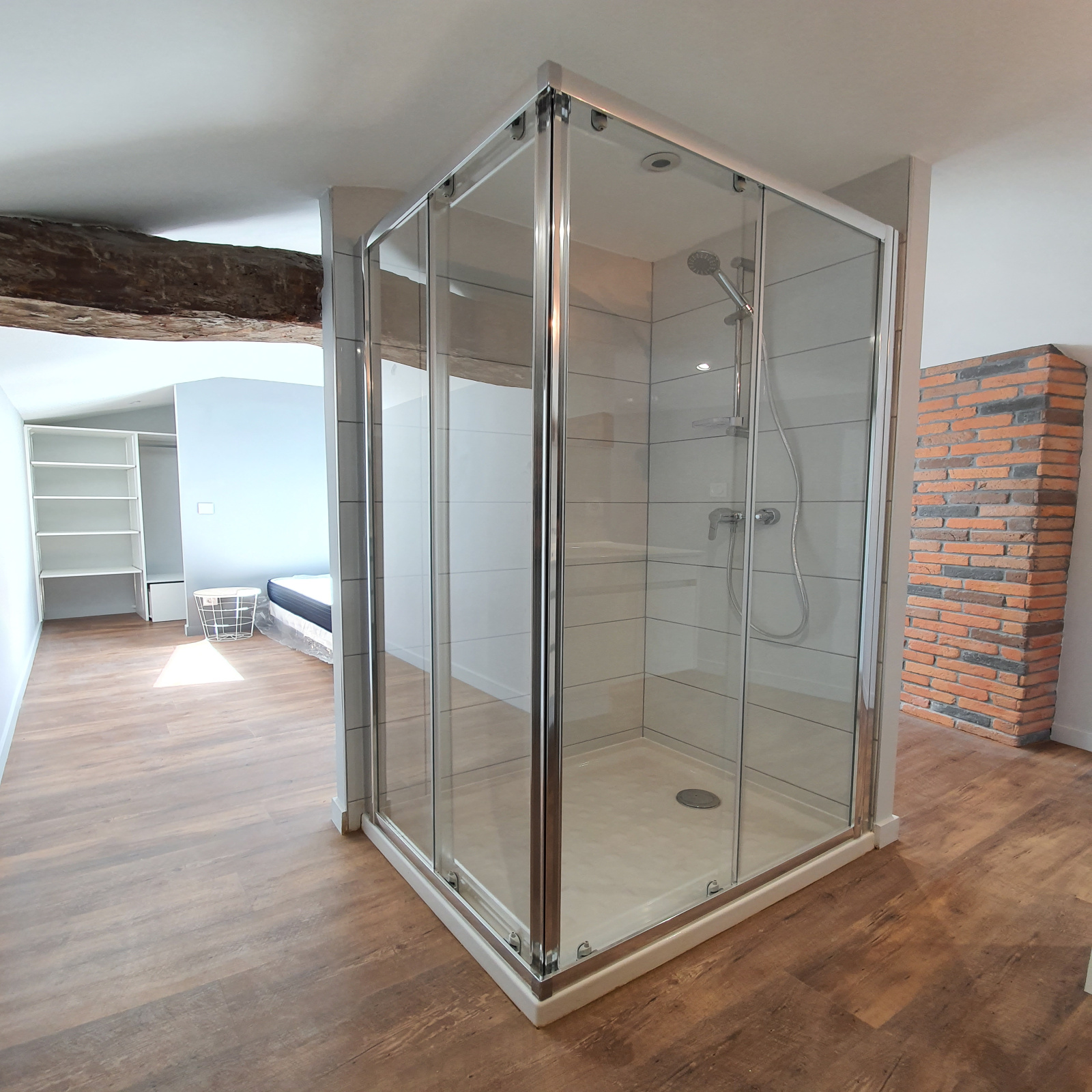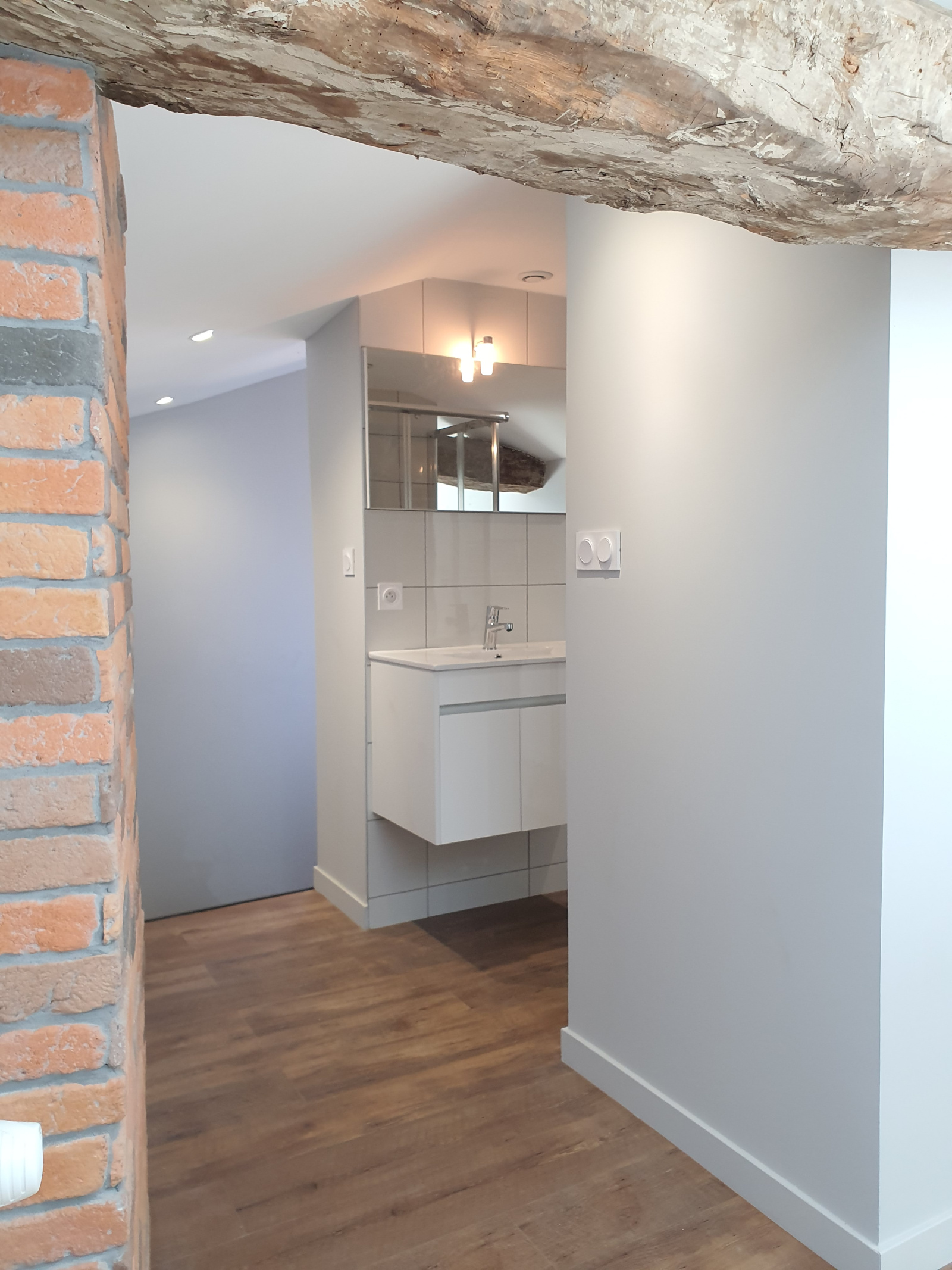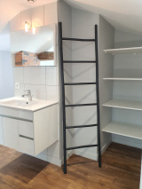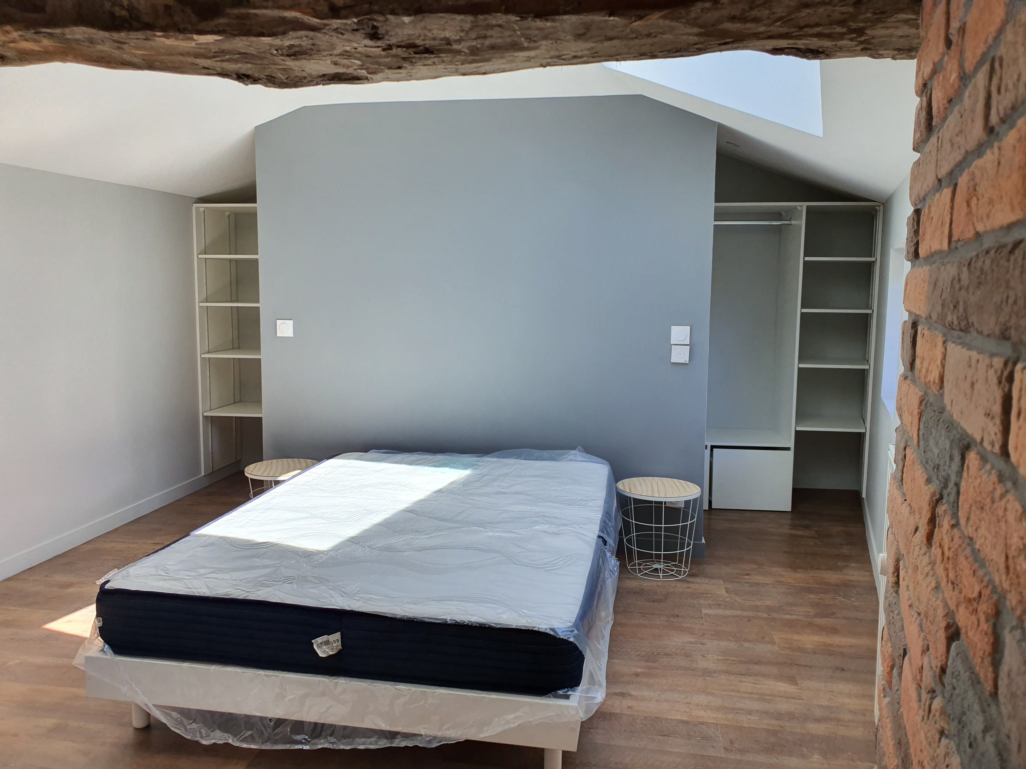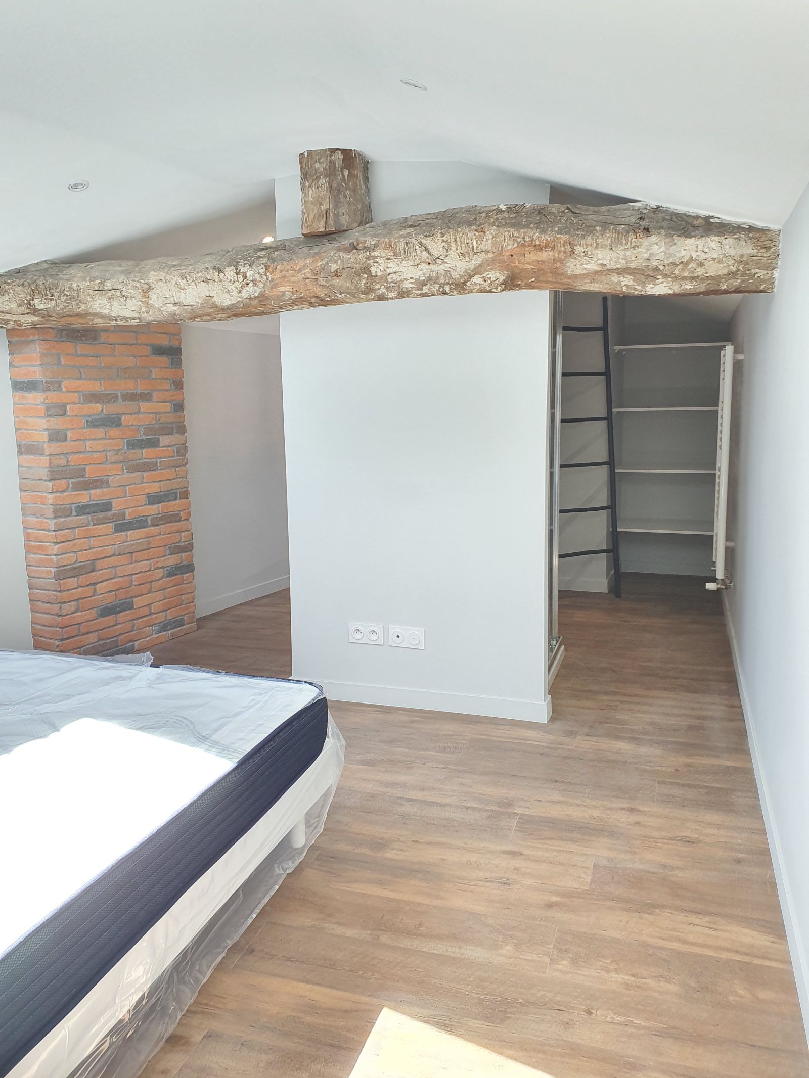 À l’étage, laissez-vous charmer par une suite parentale cosy, dotée de sa salle d’eau privative et d’un dressing fonctionnel. Les poutres apparentes apportent un cachet authentique et chaleureux à l’ensemble.